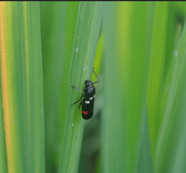 5、赤斑黑沫蟬 :赤斑黑沫蟬有逐年上升的趨勢(shì),抽穗揚(yáng)花期為害倒數(shù)1、2、3葉,吸食葉片汁液,造成功能葉發(fā)黃,最終失去功能,無(wú)法進(jìn)行光合作用而造成減產(chǎn),一般減產(chǎn)15%以上,嚴(yán)重的減產(chǎn)40%,甚至失收。前幾年區(qū)域性有發(fā)生,今年發(fā)生區(qū)域很廣,程度比往年重。