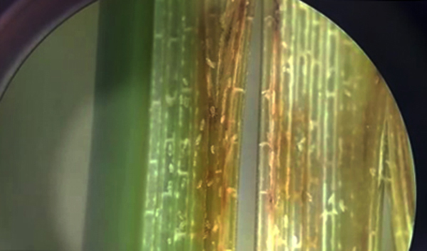 近些年水稻產(chǎn)區(qū)受到斯氏狹跗線螨等種類的為害有上升趨勢(shì),對(duì)糧食生產(chǎn)造成嚴(yán)重?fù)p失。水稻跗線螨蟲體微小,體長僅0.1~0.3毫米,一般肉眼見不到,乳白色,主要存在水稻葉鞘內(nèi),剝開葉鞘,肉眼可見葉鞘內(nèi)壁表面似有白色粉塵,用放大鏡或雙目解剖鏡觀察,可看到很多細(xì)小的螨蟲蠕動(dòng)和爬行。