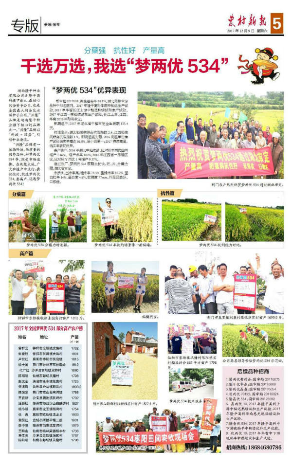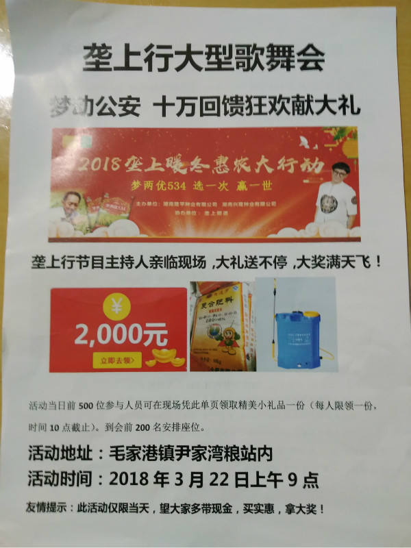 一年之計在于春,春天播散希望,農(nóng)耕開始。購種浪潮進(jìn)入最后關(guān)鍵時期。各種選種困難糾結(jié)著農(nóng)戶朋友。選什么水稻品種產(chǎn)量高,抗逆強,米質(zhì)好?當(dāng)然,首選夢兩優(yōu)534 ! 2018年3月22日。第八場夢兩優(yōu)534春耕惠農(nóng)大活動在公安縣成功舉行。上午9點,活動準(zhǔn)時開始,從周邊鄉(xiāng)鎮(zhèn)趕來的農(nóng)戶絡(luò)繹不絕,擠滿了整個糧站。 夢兩優(yōu)534紅遍大江南北,傳遍大街小巷。農(nóng)戶朋友聽說現(xiàn)場不但有節(jié)目看,更重要的是還有好谷種可以買。真是天賜良機,都爭著搶著掏錢開票,把谷種領(lǐng)回家 。 “爹爹,您怎么問都不問就掏錢買?” “小伙子啊,這個夢兩優(yōu)534我們早就知道了,谷好賣,米好吃,去年全村人開會都知道,趕緊開票,我等著看節(jié)目呢。” 是的,這就是夢兩優(yōu)534,谷好賣,米好吃,產(chǎn)量高,抗倒強。選谷種,就選夢兩優(yōu)534。 舞臺上精彩的節(jié)目表演著,舞臺下購種的浪潮一波又一波。買谷種,送禮品,抽大獎。春天,夢兩優(yōu)534帶著所有農(nóng)戶的希望播下種子,秋天,必能讓他們收獲豐收的喜悅!