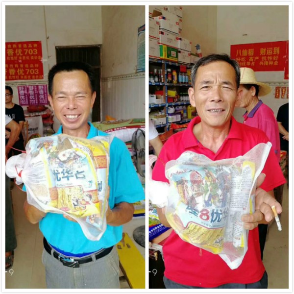 2015年區(qū)試,2016年續(xù)試,2017年國審,歷經(jīng)三年試驗示范,隆8優(yōu)華占得到了廣大農(nóng)戶經(jīng)銷商的高度認(rèn)可。三年磨一劍、今朝露鋒芒,2018年的這個夏天八仙稻迎來了屬于它的時刻。 這個夏天最美的風(fēng)景就是老百姓手握著著豐收的希望,臉上展露的笑容。在老百姓的心中八仙稻是這一季豐收的希望。 "我要6斤","我要9斤","我要20斤",門店里此起彼伏的聲音里是老百姓對隆8優(yōu)華占的信賴和認(rèn)可,是他們對豐收的渴望。 火紅的六月,熱情的農(nóng)戶。品種這么多,你需要一個高產(chǎn)高抗米質(zhì)優(yōu)的品種,而我就是你最適合的那一個。一包又一包八仙稻在老百姓的期盼中走進千家萬戶,為他們送去了豐收的希望。
