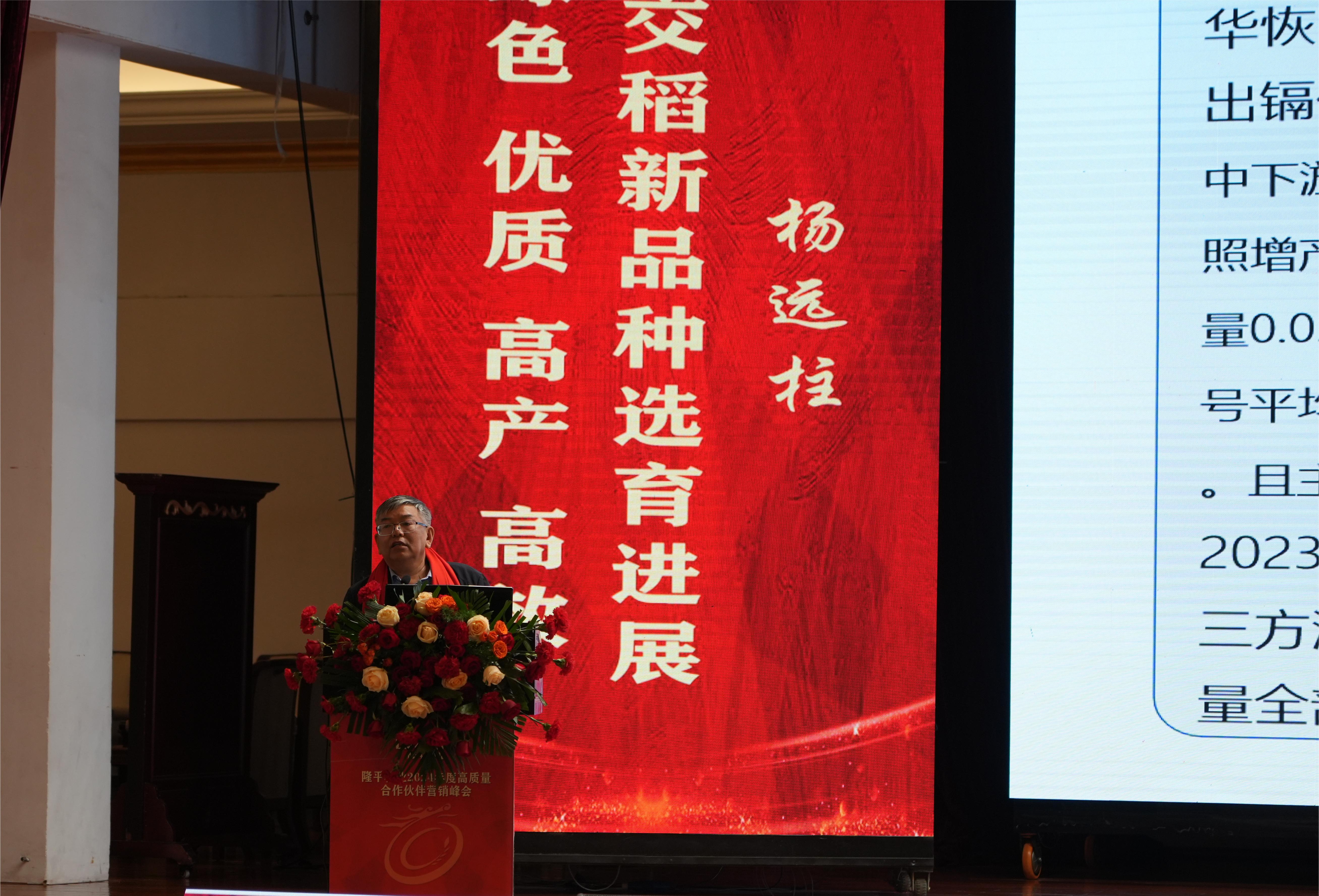 研發(fā)是隆平的核心優(yōu)勢,大會首先由隆平高科副總裁、種業(yè)科學(xué)院院長楊遠柱作《綠色優(yōu)質(zhì)高產(chǎn)高效新品種選育進展》分享,報告結(jié)合當前國際局勢與糧食安全問題闡述了綠色優(yōu)質(zhì)廣適高產(chǎn)雜交水稻的選育背景及戰(zhàn)略意義,并重點就隆平種業(yè)獨家運作的第五代大品系——颶兩優(yōu)系列,以及朝湘優(yōu)、晨鋒優(yōu)、臻蓮兩優(yōu)等系列品種特征特性及優(yōu)勢作了全面深入的闡述。楊院長充分肯定了公司后續(xù)品種的潛力,超強的品種資源進一步堅定了客戶長期與隆平種業(yè)合作的信心。