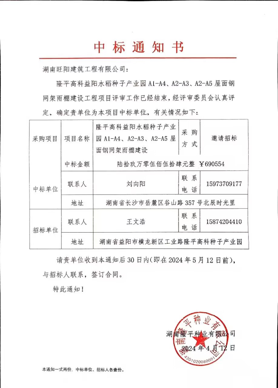 隆平高科益陽水稻種子產(chǎn)業(yè)園 A1-A4、A2-A3、A2-A5屋面鋼網(wǎng)架雨棚建設(shè)工程 中標(biāo)通知書