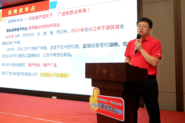 隨后,湖南銷售中心宋建東從豐收的基石、豐收的季節(jié)、豐收的喜悅三大方面對冠兩優(yōu)華占的品種特性做詳細闡述:分蘗能力強、高產(chǎn)穩(wěn)產(chǎn)、耐逆性好,抗病性強、抗倒性好,適合大戶規(guī)模化種植。冠兩優(yōu)華占推廣四年來,高產(chǎn)抗倒的優(yōu)勢得到全國大戶朋友的廣泛青睞。