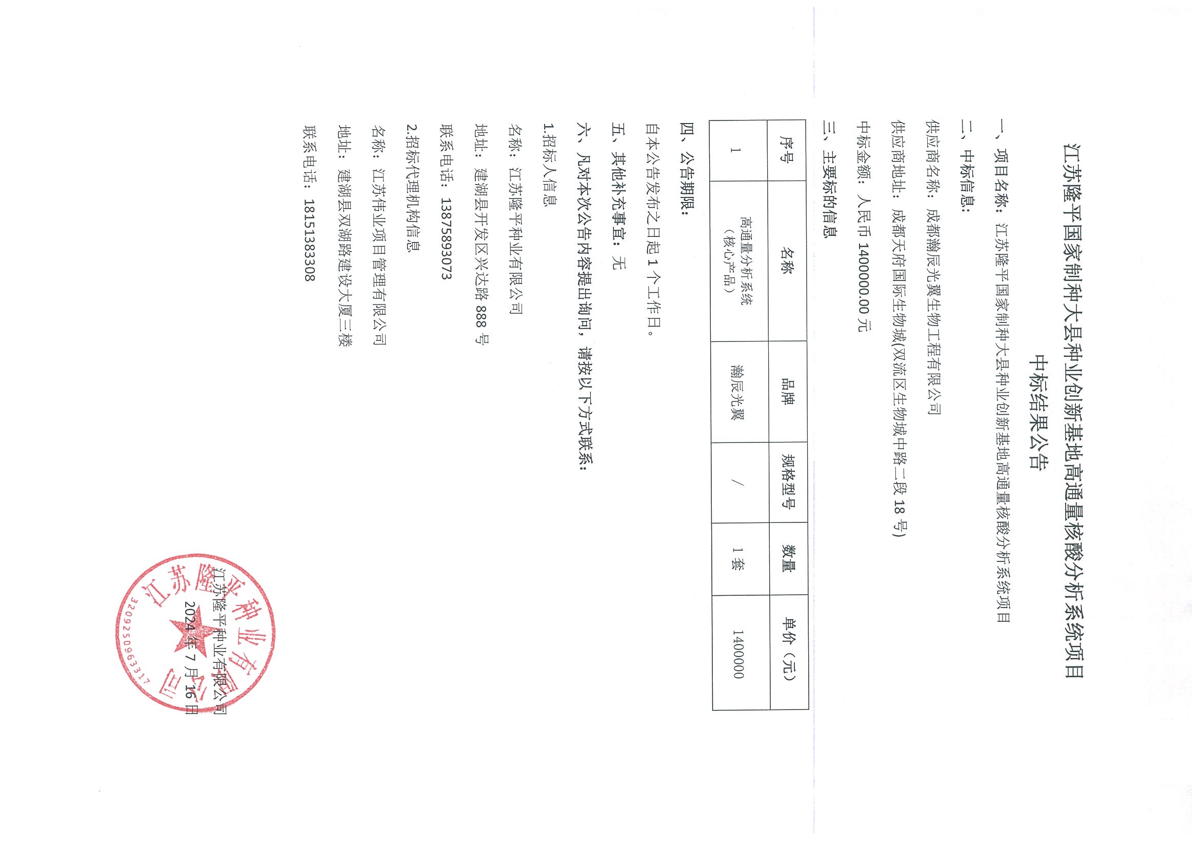 江蘇隆平國家制種大縣種業(yè)創(chuàng)新基地高通量核酸分析系統(tǒng)項目中標(biāo)結(jié)果公告