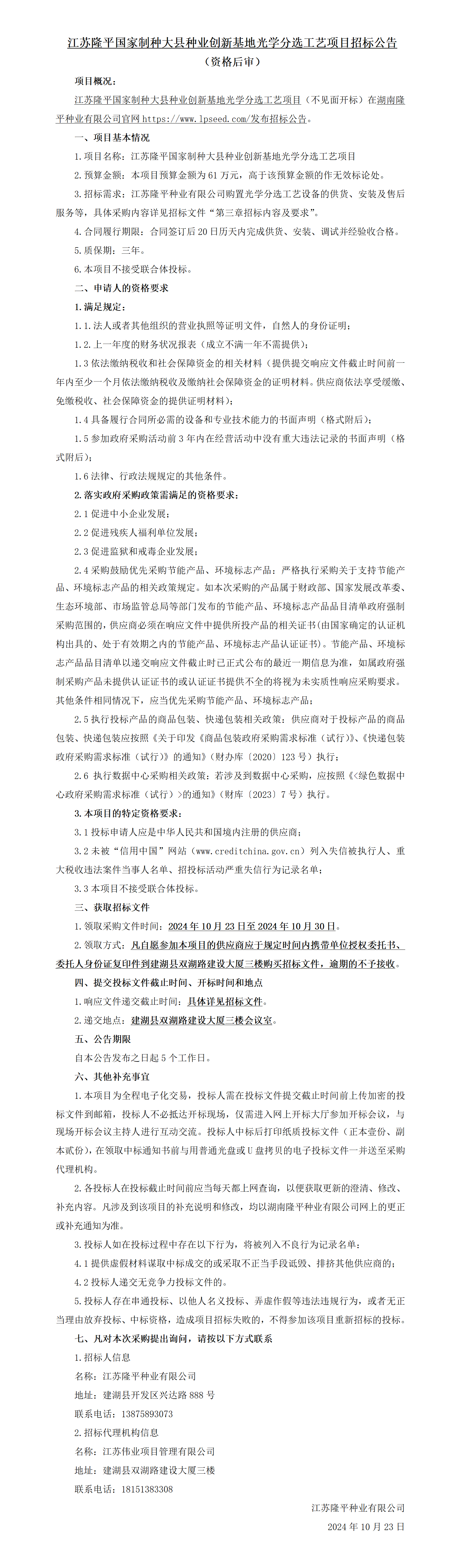 江蘇隆平國(guó)家制種大縣種業(yè)創(chuàng)新基地光學(xué)分選工藝項(xiàng)目招標(biāo)公告