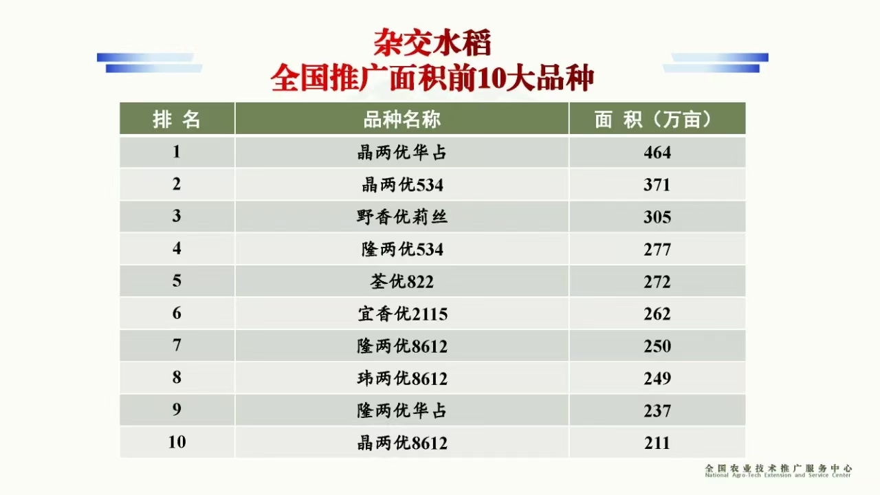 大會(huì)還發(fā)布了《2023年度雜交水稻全國(guó)推廣面積前10大品種》,公司晶兩優(yōu)華占、晶兩優(yōu)534分別以464萬(wàn)畝、370萬(wàn)畝的推廣面積蟬聯(lián)第一、第二名。值得一提的是,2018年-2023年,晶兩優(yōu)華占、晶兩優(yōu)534已連續(xù)六年包攬雜交水稻推廣面積全國(guó)前二。