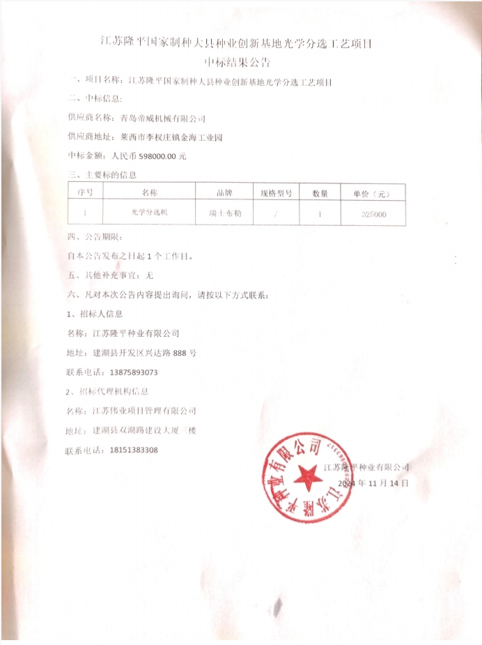 江蘇隆平國家制種大縣種業(yè)創(chuàng)新基地光學(xué)分選工藝項(xiàng)目中標(biāo)結(jié)果公告