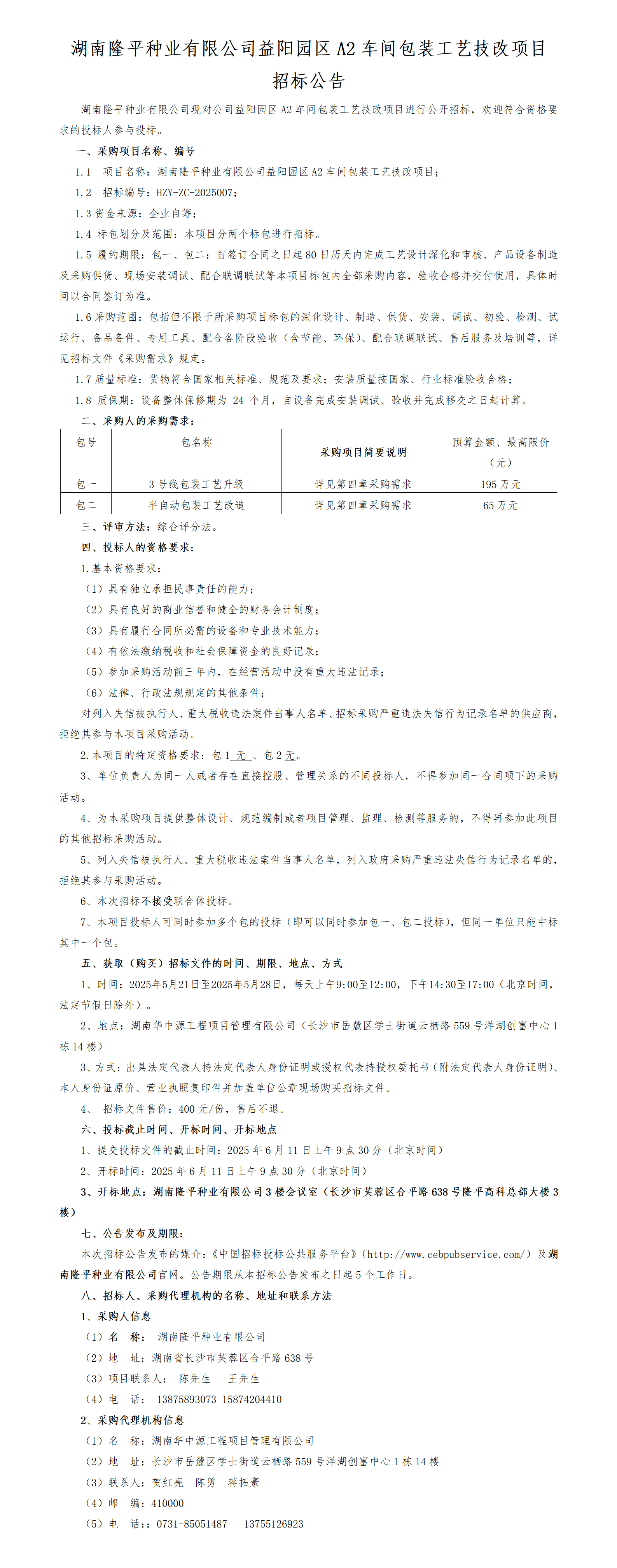 湖南隆平種業(yè)有限公司益陽園區(qū)A2車間包裝工藝技改項目招標公告