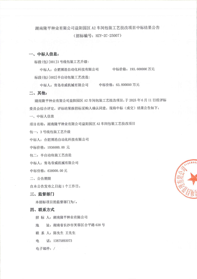 湖南隆平種業(yè)有限公司益陽園區(qū)A2車間包裝工藝技改項目中標(biāo)結(jié)果公告