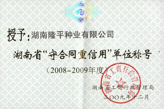 近日,公司被湖南省工商行政管理局授予湖南省“重合同守信用”單位稱號(2008-2009年度)。