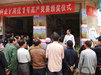 鞭炮轟鳴,喜慶熱鬧。連日來(lái),在欽州、玉林、河池等廣西各地市,Y兩優(yōu)1號(hào)高產(chǎn)栽培競(jìng)賽的鼓勵(lì)獎(jiǎng)、三等獎(jiǎng)、二等獎(jiǎng)、一等獎(jiǎng)各歸其主,轟鳴的鞭炮聲將各地頒獎(jiǎng)儀式的熱烈氣氛推向了高潮。
