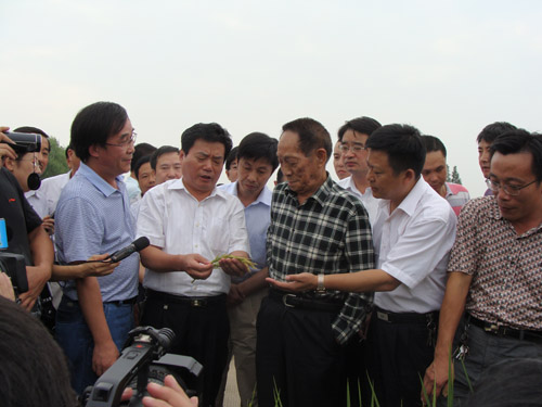 8月28日,國家雜交水稻工程技術(shù)研究中心(以下簡稱雜優(yōu)中心)信陽分中心成立并正式授牌。為此,袁隆平院士率羅孝和、馬國輝、鄧啟云、鄧小林等專家提前兩天趕到信陽,觀摩兩優(yōu)1128等由雜優(yōu)中心選育的強勢雜交水稻新品種的百畝田間示范表現(xiàn)。
