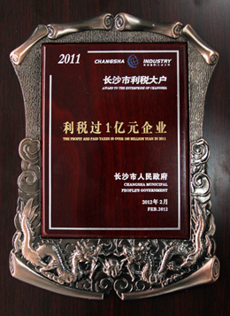 熱烈祝賀我司榮獲“二O一一年度長沙市利稅大戶——利稅過一億元的企業(yè)”光榮稱號。