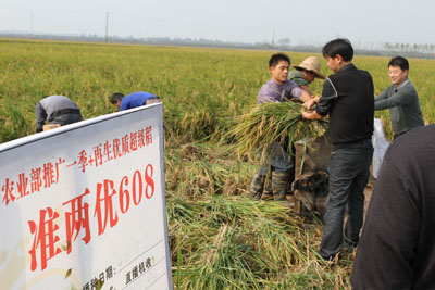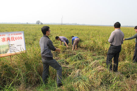 10月27日,秋高氣爽,稻穗飄香。常德市鼎城區(qū)的一片準兩優(yōu)608示范田里洋溢著一陣陣豐收的喜悅,今天將由湖南雜交水稻研究中心組織有關專家對我司自主選育的兩系雜交稻“準兩優(yōu)608”一季加再生模式再生稻進行現(xiàn)場測產驗收,專家組隨機抽取一塊田,實割面積113.8平方米,濕谷78.4公斤,最終折合干谷平均畝產367.6公斤,加上此前頭季測產驗收的701.4公斤/畝,這片準兩優(yōu)608一季加再生模式示范片畝產達到1069公斤,成為名副其實的“噸稻”。