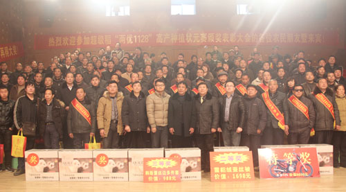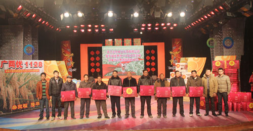 2013年1月12日,天門市電視臺(tái)一號(hào)演播大廳歡聲如潮,主題為“生財(cái)有稻”天門市2011—2012年度兩優(yōu)1128高產(chǎn)種植狀元賽頒獎(jiǎng)典禮正在舉行。來自全市的100多名種植能手齊聚一團(tuán),共慶豐收的喜悅。