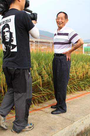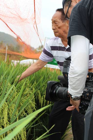 4月17日,湖南衛(wèi)視到我司南繁新品種展示基地拍攝袁隆平“中國夢”。一下車,袁院士顧不得雨后道路的濕滑,領(lǐng)著湖南衛(wèi)視的記者們快步走到展示田間,向記者們介紹品種的株葉形態(tài),分蘗情況,穗粒結(jié)構(gòu)等。