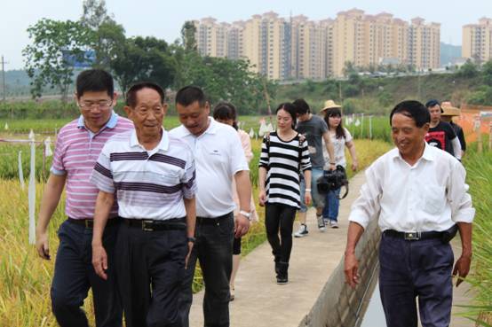 沿著田肩一路走來,展示著我司最新研發(fā)的新品種 “深08S/R1813、廣占63-2S/R1813、廣占63-4S/R1813、宣69S/R1813、新安S/R1813、Y58S/R1813、2710S/HR1128、深08S/AC206、深08S/C995、深08S/湘恢012、3455S/HR1128等”,在每個(gè)品種旁,袁院士總是喜歡停下來,用手?jǐn)堉豢|縷穗子,就像撫摸著自己的“愛子”一樣,親切而慈祥的觀察著。“咱們的第四期超級(jí)稻攻關(guān),就需要他們”,袁院士樂呵呵的說!