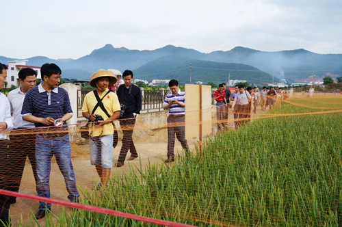 展示田里,除了“Y58S/R1813”,還有其它公司最新研發(fā)的新品種“深08S/R1813、廣占63-2S/R1813、廣占63-4S/R1813、宣69S/R1813、新安S/R1813、2710S/HR1128、深08S/AC206、深08S/C995、深08S/湘恢012、3455S/HR1128等系列品種,一株株水稻仍清秀挺拔地地立在田間,等待著遠道而來朋友的檢閱。公司常務副總經理龍和平為大家細心講解了公司的研發(fā)情況和強勢后續(xù)品種資源。