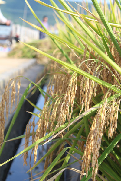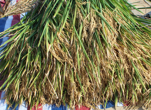 驗收小組在深08S/R1813的示范田中隨機選取了三個測產(chǎn)點,每個點劃定50平方米面積,現(xiàn)場收割,脫粒,共計收割面積150.08平方米,毛重為244.3公斤;折合成含水量13.5%的干谷,凈重為212.5公斤,換算成畝產(chǎn)為944公斤。