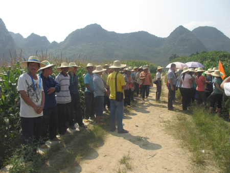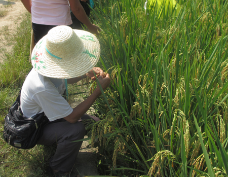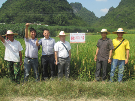 秋高氣爽,沉甸甸的稻穗迎風擺動。廣西崇左市天等縣于9月18日上午在龍茗鎮(zhèn)那乙屯召開了隆平1號示范觀摩會。來自天等縣各鄉(xiāng)鎮(zhèn)的零售商、種田大戶及那乙屯農(nóng)戶86人前來觀摩。示范田邊,有的忙著數(shù)穗粒數(shù),有的忙著照相,有的忙著探討栽培技術(shù),個個贊不絕口。