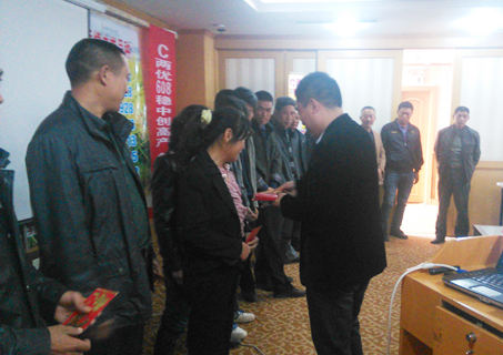 2013年10月23日,襄陽(yáng)C兩優(yōu)608高產(chǎn)擂臺(tái)賽頒獎(jiǎng)大會(huì)在襄陽(yáng)麗源大酒店隆重舉行。與會(huì)的有百十位獲獎(jiǎng)農(nóng)戶(hù)以及數(shù)十位C608零售商。會(huì)上,盧成林經(jīng)理向大家介紹了隆平種業(yè)今后的發(fā)展、公司后續(xù)品種,重點(diǎn)介紹了C兩優(yōu)608及后續(xù)品種的營(yíng)銷(xiāo)政策。交流過(guò)后,大家對(duì)C兩優(yōu)608信心滿(mǎn)滿(mǎn)。