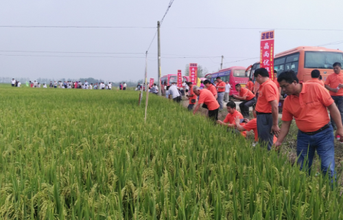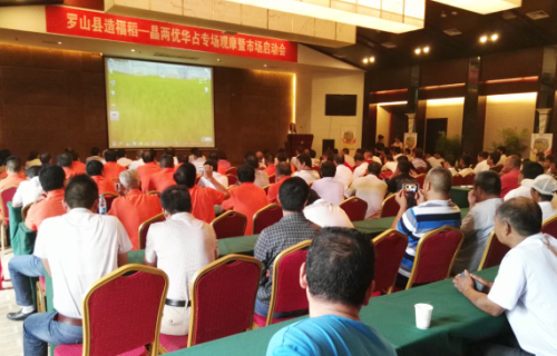 9月1日,秋高氣爽,來自潢川、光山、平橋、息縣的種業(yè)精英共50多人以及羅山縣零售商、種田大戶近百人齊聚羅山縣,共同見證“造福稻——晶兩優(yōu)華占”的“出嫁”之旅。