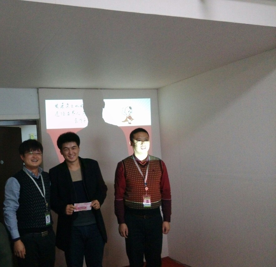 會(huì)議上講師和大家做一個(gè)小游戲進(jìn)行新老互動(dòng),一個(gè)很幸運(yùn)的實(shí)習(xí)生獲得獎(jiǎng)勵(lì),并一起合影。