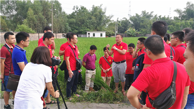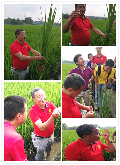 在田間,參訓人員抓住這次難得的機會,請教自己在工作中遇到的技術問題,如如何區(qū)分雜草稻,如何預估水稻破口期及時打藥,如何快速區(qū)分自己公司品種和其他公司品種等,廖老師頂著烈日,耐心細致地為大家答疑解惑。為了更好地解答大家的疑惑,廖老師還結合前期華南的各地實際情況,有針對性地為大家講解了防治矮縮病以及怎樣幫助農戶增產增收等關鍵知識。在田間2個半小時的學習讓大家受益匪淺,滿載而歸。