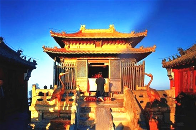 登上金頂,一座金殿巋然立在石臺(tái)中央,金碧輝煌,精美絕倫。環(huán)繞金殿一周,即見“七十二峰朝大頂”之曠世奇景,讓人心中油然生起俯仰萬物,睥睨天下的豪邁。